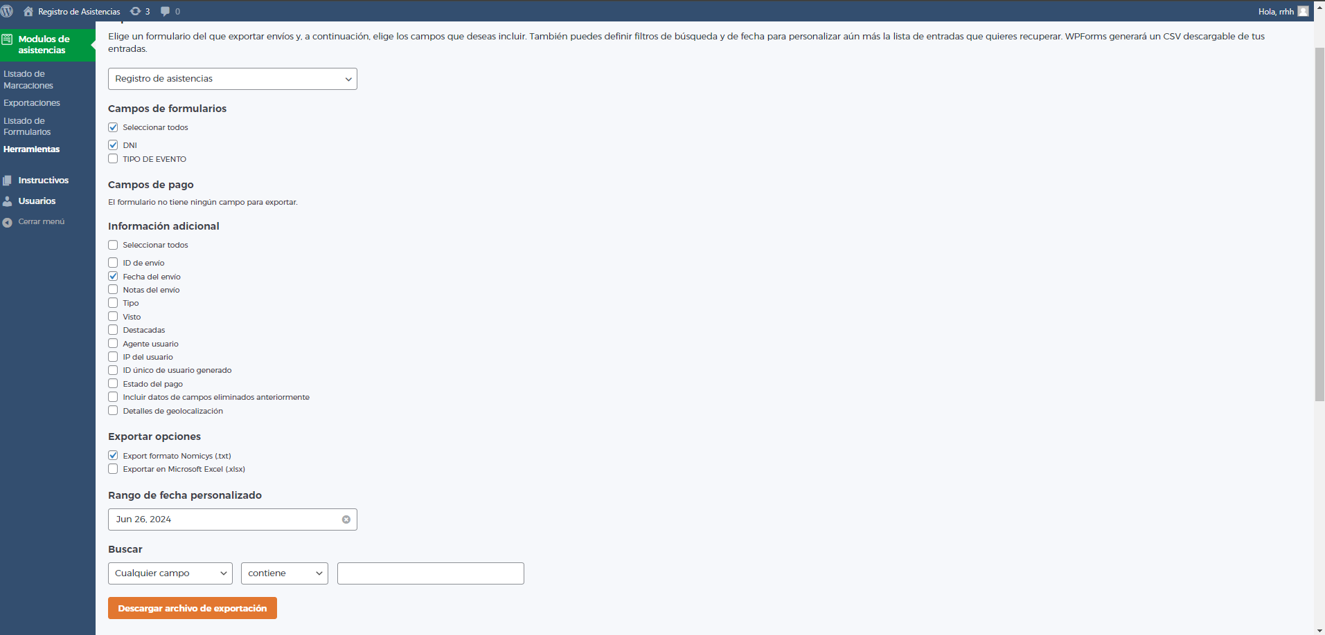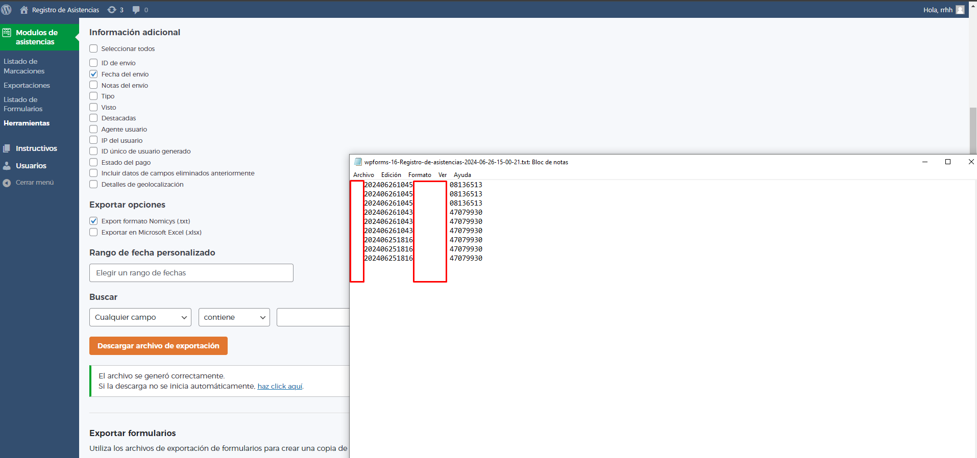 DNI, FECHA聽 y tipo de archivo(.txt) a exportar